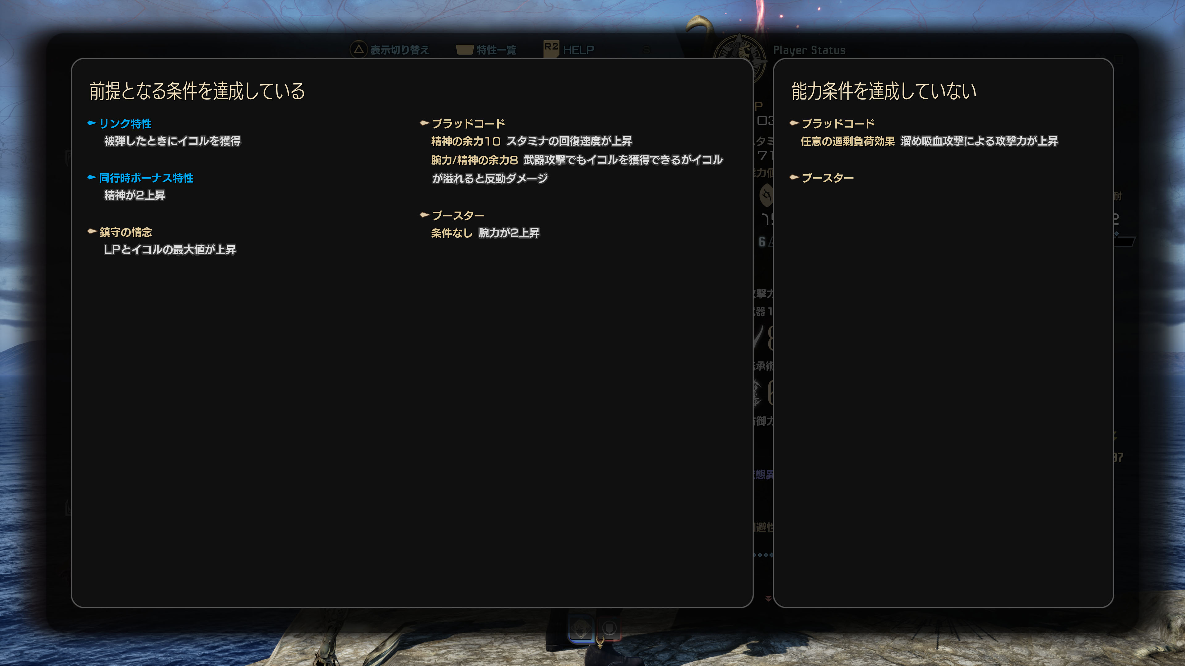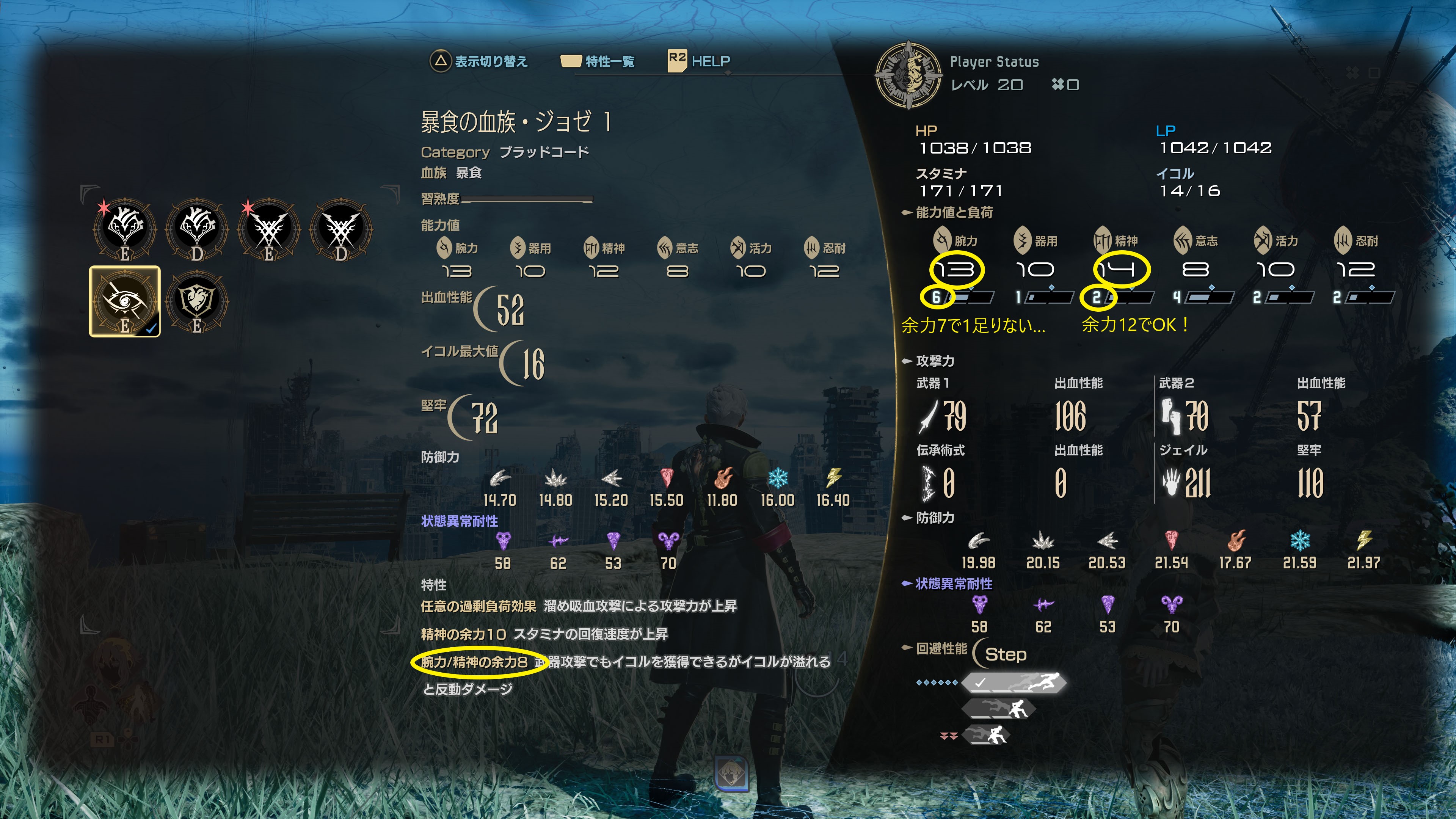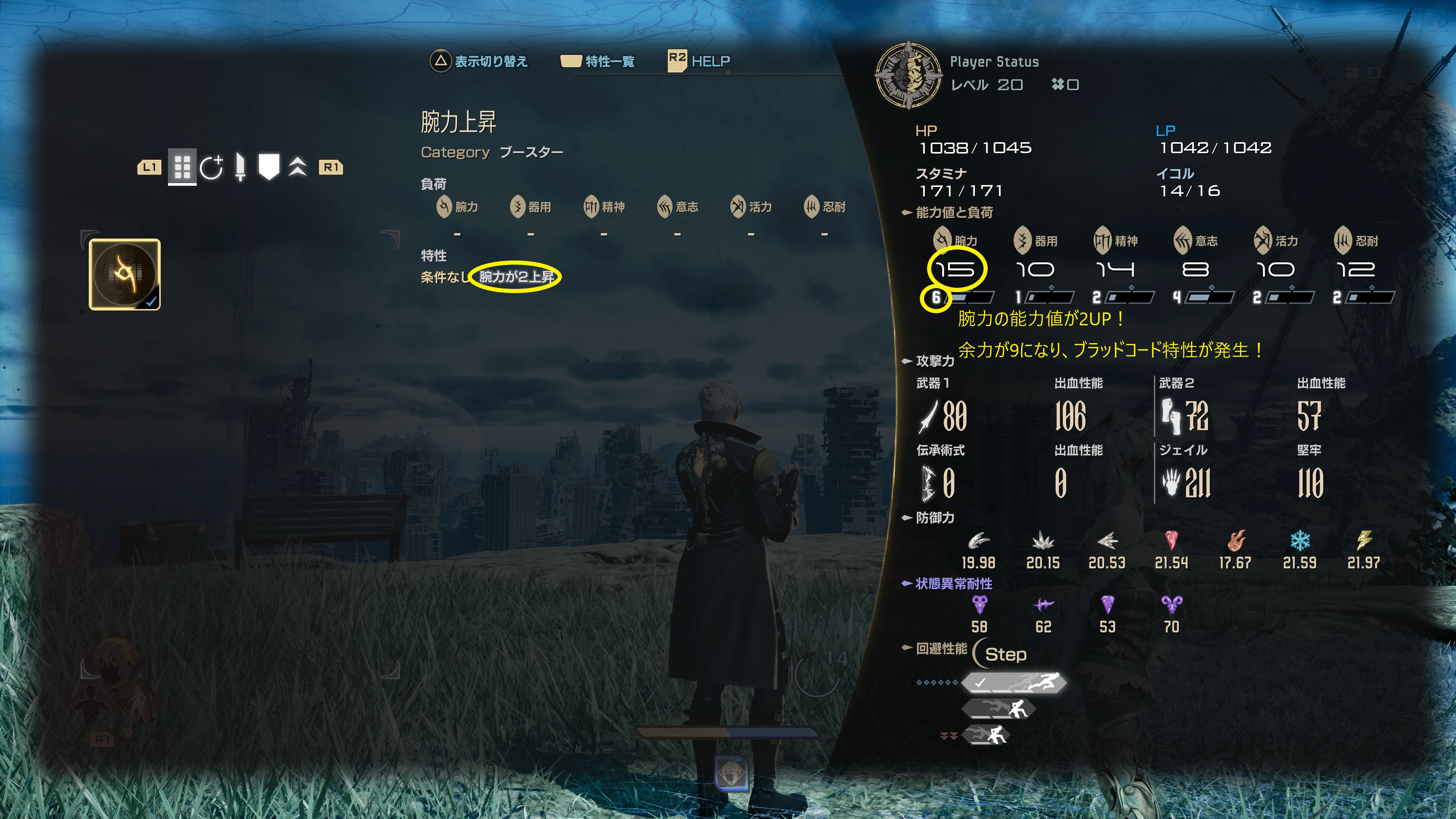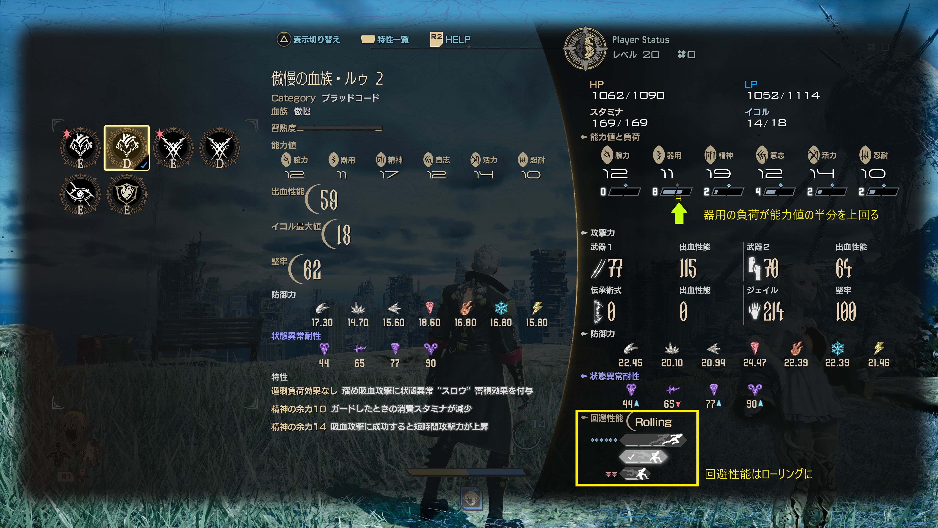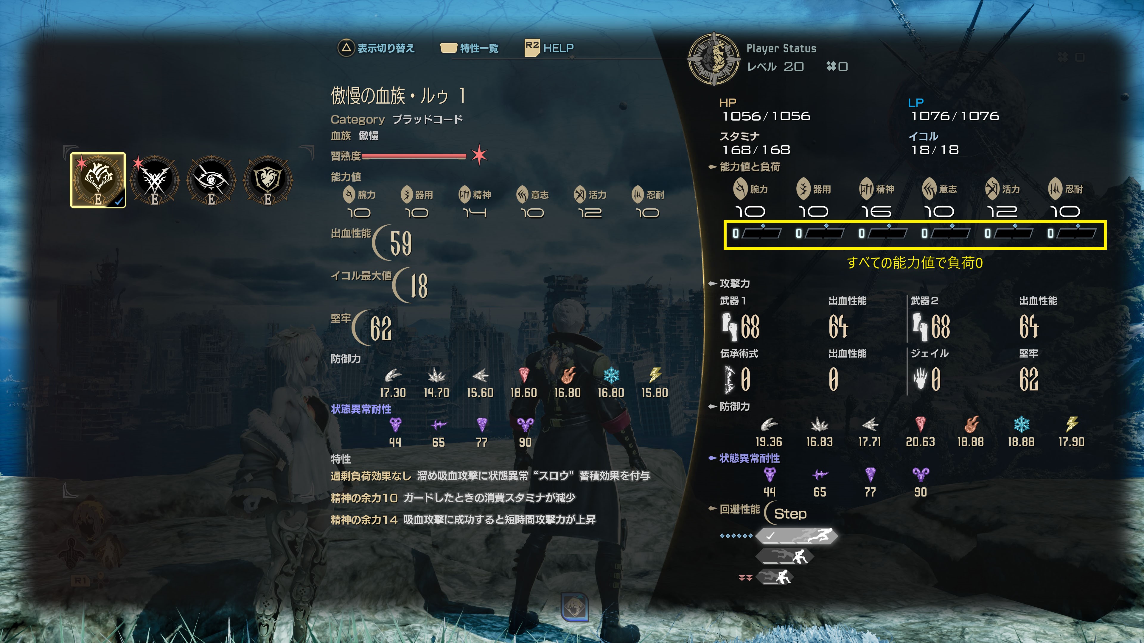 そのため回避性能をステップにしたい場合は、まず武器の負荷状況みたうえでブラッドコードを選択してみるのをおススメします。