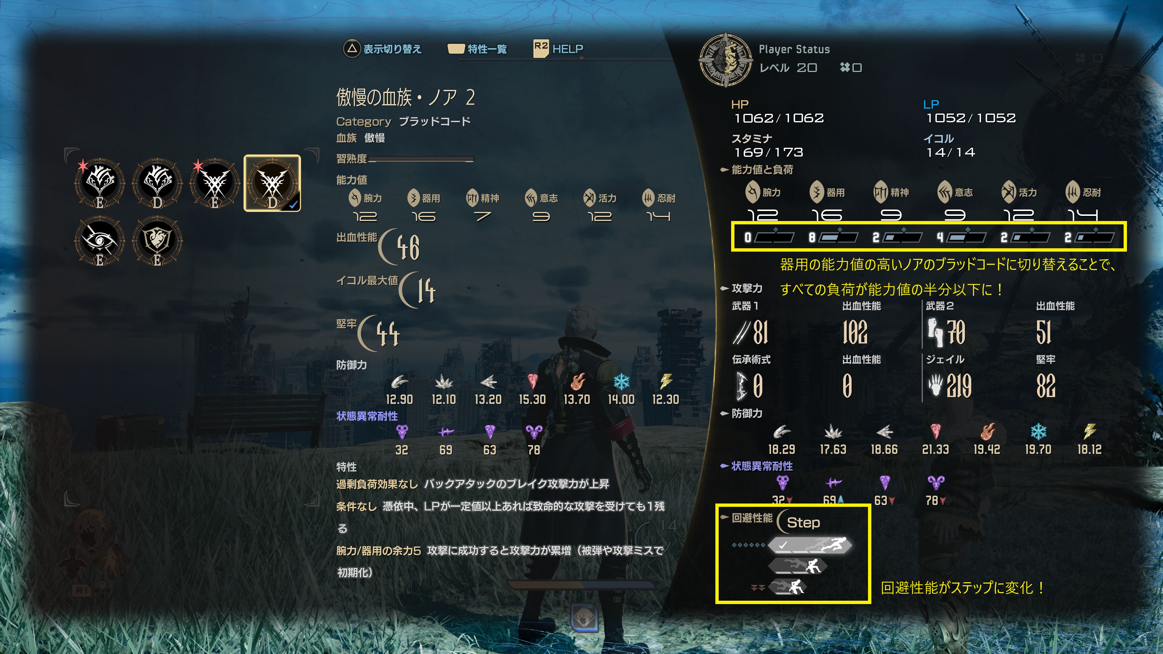 例えば器用の負荷が高い銃剣は、同じく器用の能力値の高いノアのブラッドコードを採用してみると、負荷が能力値の半分を下回りステップが可能となることがあります。