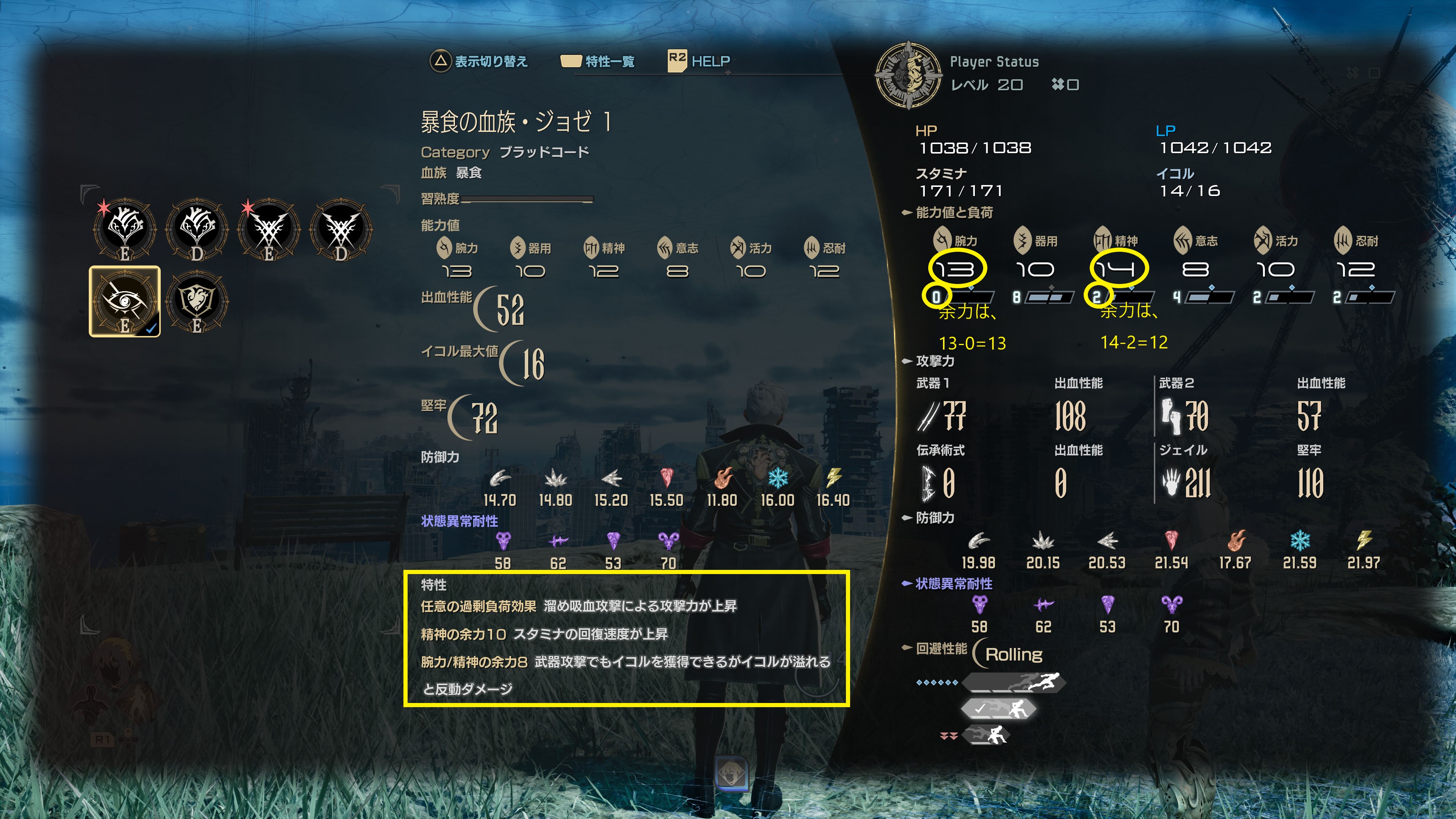 特性の多くは能力値の「余力」(能力値と負荷の差分)条件を満たすことで発生します。