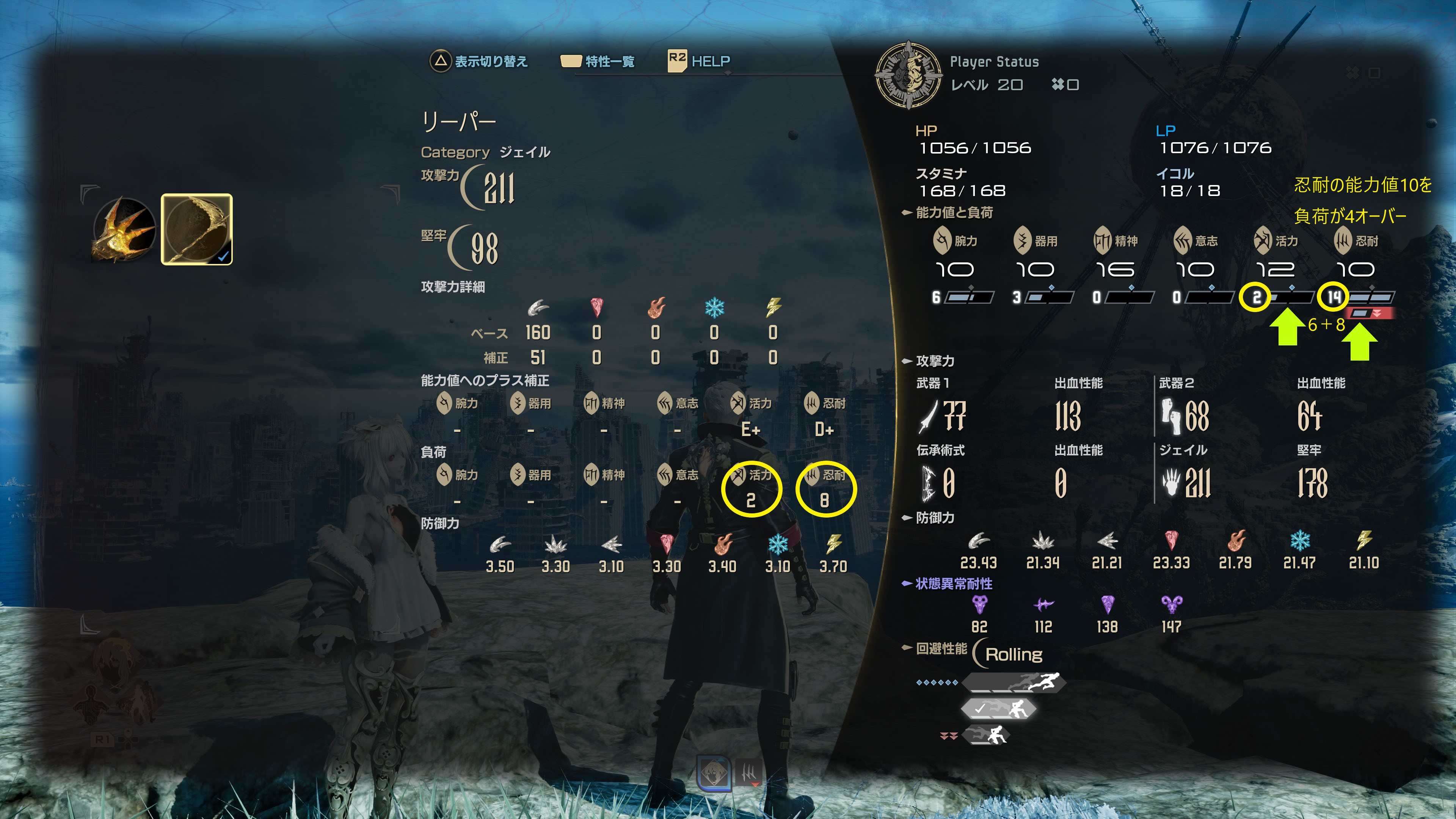 そして最後にジェイル「リーパー」を装備してみると、≪活力2≫≪忍耐8≫の負荷がステータスに反映されました。