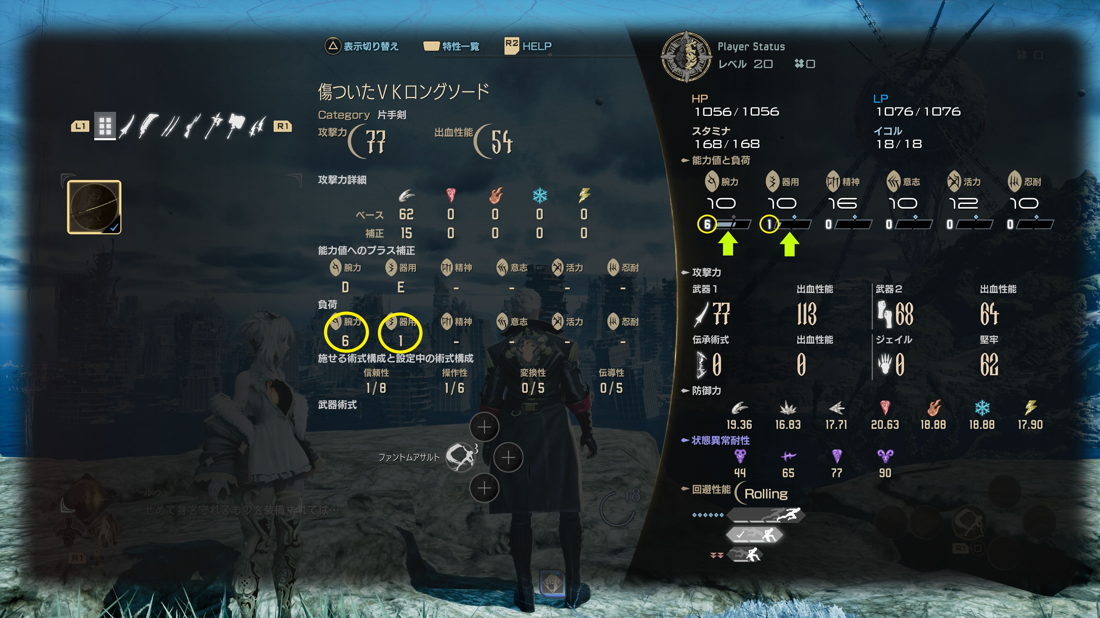 例えば、最も高い回避性能「ステップ」を維持するためには全ての能力値において、装備負荷が能力値の半分を下回る必要があります。