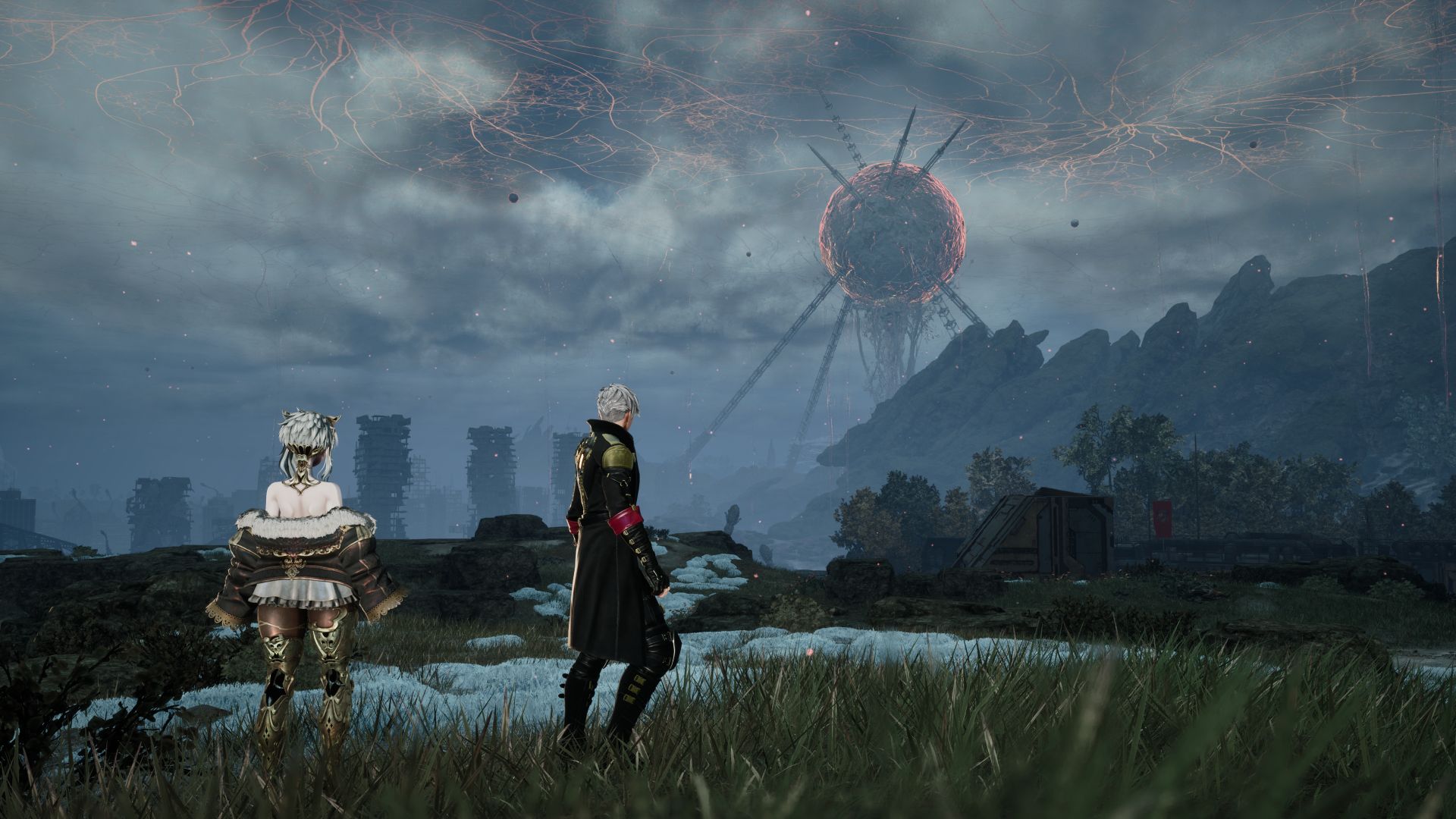 「現在の世界」を一言で表すなら「静かに忍び寄る死の世界」です。「渇望の月」と呼ばれる不気味にただれた球体が天高くに浮かび、世界を蝕む胞子をばらまいています。渇望の月からは粘菌のような繊維が伸びて天空を覆い尽くし、地上では灰色のカビのような謎の物体が増殖しているのです。