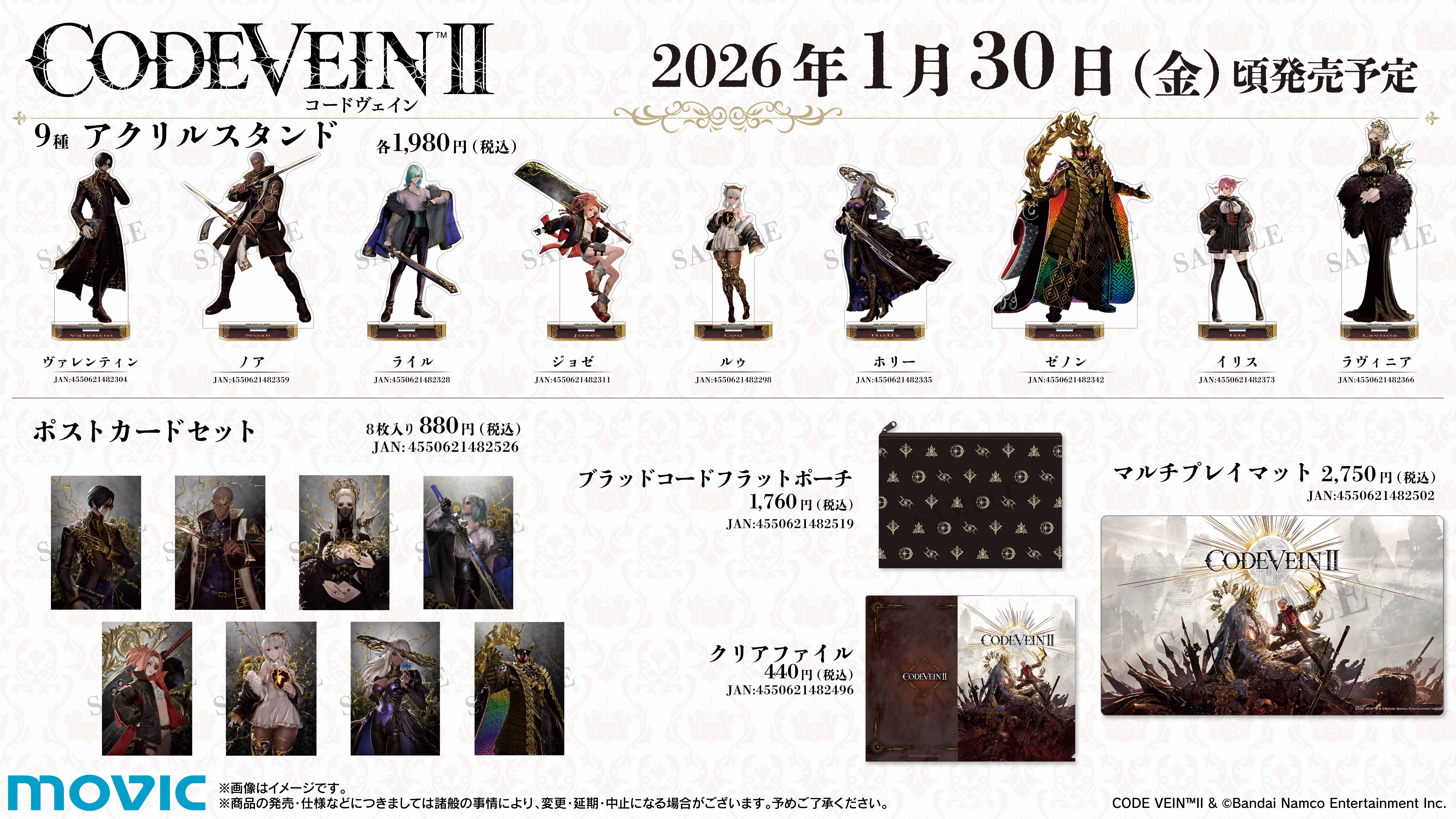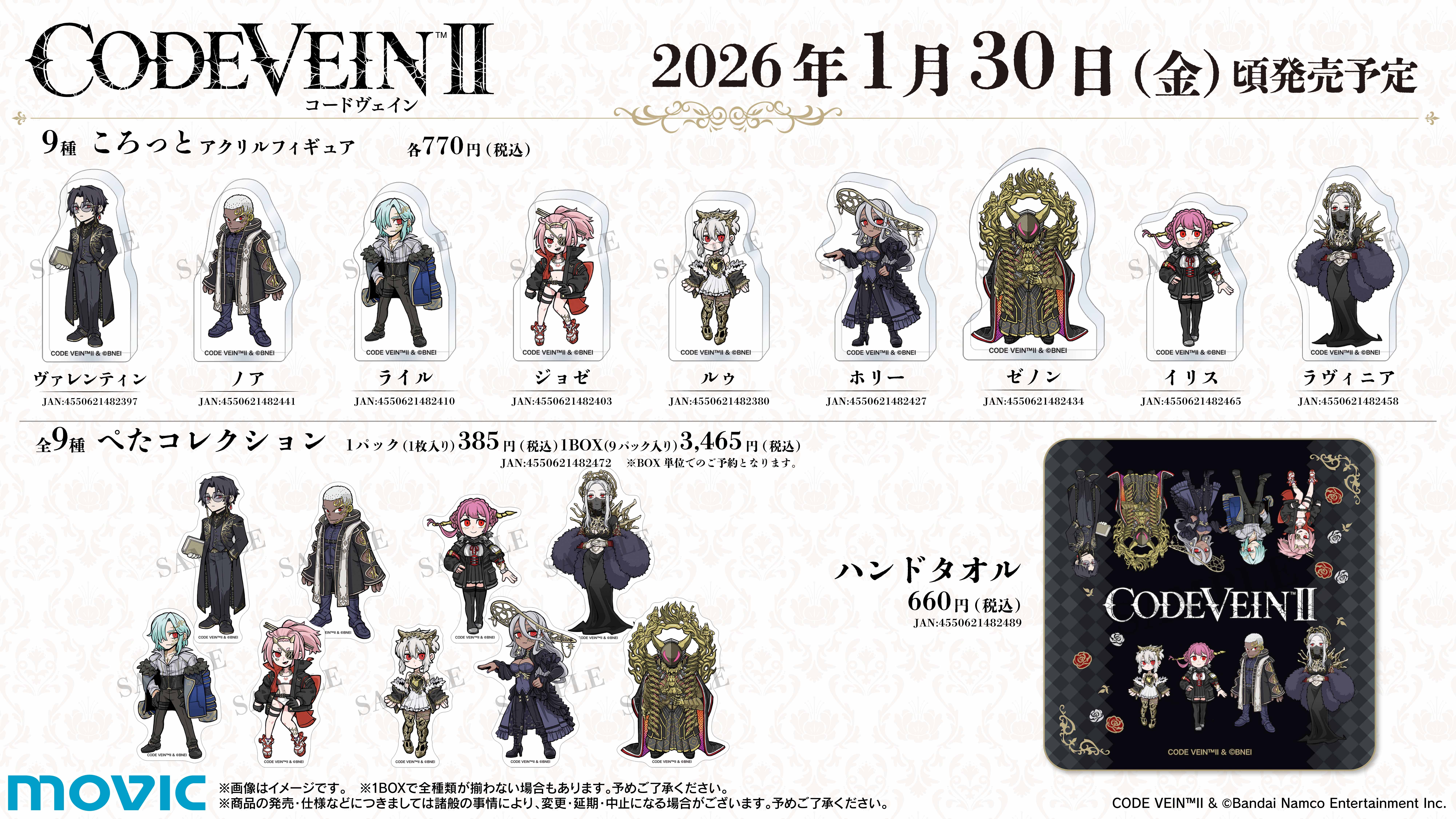 ムービックより「CODE VEIN II」の新商品「アクリルスタンド」「ポストカードセット」「クリアファイル」「マルチプレイマット」「ブラッドコードフラットポーチ」「ころっと アクリルフィギュア」「ぺたコレクション」「ハンドタオル」が登場です!